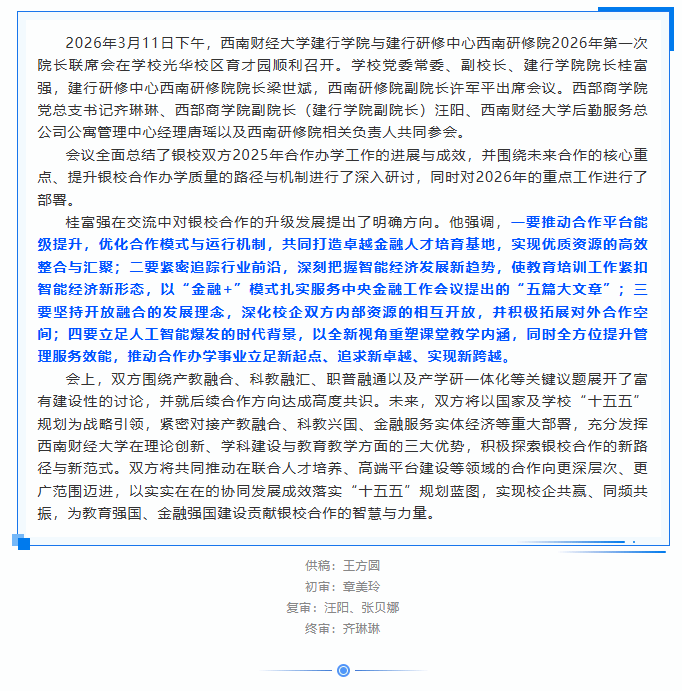 熟女av 建行熟女av 与建行研修中心西南研修院召开2026年第一次院长联席会